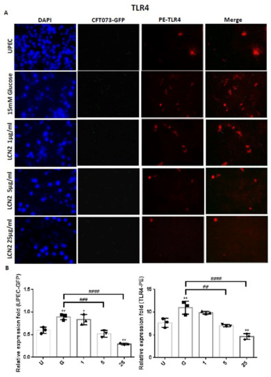 LCN2 decreased UPEC infections and TLR-4 expression in bladder cells. SV-HUC-1 cells were first pretreated with 15 mM glucose, followed by treatment with different concentrations of LCN2 (1, 5, and 25 μg/mL) for 24 h and infection with pGFP-UPEC (MOI of 1:100) for 4 h, as described in the text. The definitions of the letters on the X axis: U, UPEC infection alone; G, with 15 mM glucose pretreatment alone. GFP-UPEC and PE-TLR-4 expression in SV-HUC-1 cells, for 4 h postinfection, were (A) observed by fluorescence microscopy and (B) measured using ImageJ software. Cells infected with UPEC alone were used as positive controls. The pictures shown are representative of typical results. DAPI was used to count the number of cells and as a standard for calculating the fluorescence expression ratios of cells. Cell images were captured using a microscope (Leica) at 100× magnification. The data are expressed as means ± SDs from three separate experiments. An analysis of variance was used to evaluate differences between various treatment groups and controls. Statistical differences between groups were determined using the Mann–Whitney U Student’s t-test. Statistical significance was set at p < 0.05. * p < 0.05, ** p < 0.01 compared to the positive control groups. ## p < 0.01, ### p < 0.001, #### p < 0.0001 for comparisons between two groups.