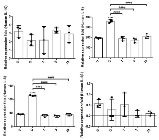 The cell culture medium was centrifuged (13,000× g for 20 min at 4 °C), and the supernatant was assessed using a human inflammatory cytokine CBA (BD Biosciences, San Diego, CA, USA) for the cytokines IL-8, IL-10, IL-1β, and IL-6. The cytokine capture bead, PE detection reagent, and recombinant standards or test samples were incubated for 3 h at room temperature. An FACSCanto flow cytometer (BD Biosciences, San Diego, CA, USA) was used to acquire the data, which were analyzed using the BD CBA analysis software to produce graphs [42,43].