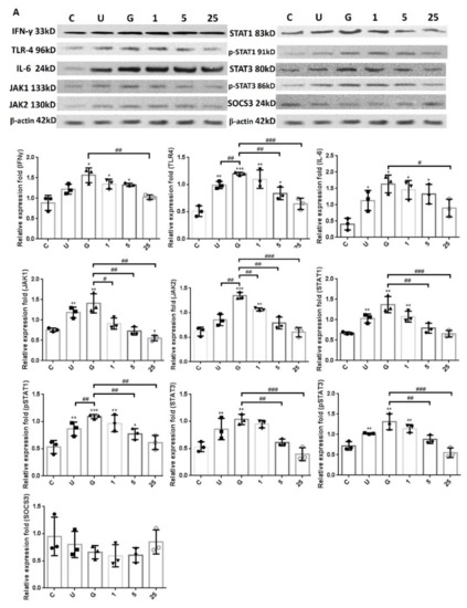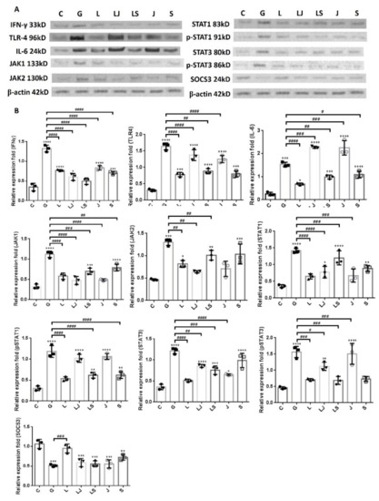 The proteins in the samples were harvested using RIPA lysis buffer (Millipore; Burlington, MA, USA). The experimental procedure was conducted as per our previous publication [29]. The antibodies used were as follows: anti-JAK1 (BD Biosciences; San Diego, CA, USA), anti-JAK2, anti-STAT1 (Cell Signaling, Beverly, MA, USA), anti-pSTAT1, anti-STAT3 (Cell Signaling, Beverly, MA, USA), anti-pSTAT3, anti-suppressor of cytokine signaling 3 (SOCS3, Abcam; Cambridge, UK), anti-interferon (IFN)-γ (Abcam), anti-TLR-4 (Proteintech; Rosemont, IL, USA), anti-interleukin (IL)-6 (Bioworld Technology; Bloomington, MN, USA), and anti-β-actin (Santa Cruz; Dallas, TX, USA) at room temperature (~25 °C) for 1 h. After incubation with an appropriate secondary horseradish-peroxidase-conjugated IgG antibody (R&D Systems; Minneapolis, MN, USA) for 30 min at room temperature, the protein bands on the membrane were detected using an ECL-Plus Western Blot Detection system (GE Healthcare UK Ltd.; Buckinghamshire, UK) according to the manufacturer’s instructions. All experiments were performed at least three times. A graphical analysis of band density was performed using ImageJ software (version 1.41o) (National Institutes of Health, Bethesda, MD, USA) (http://rsb.info.nih.gov/ij/, accessed on 2 October 2012).