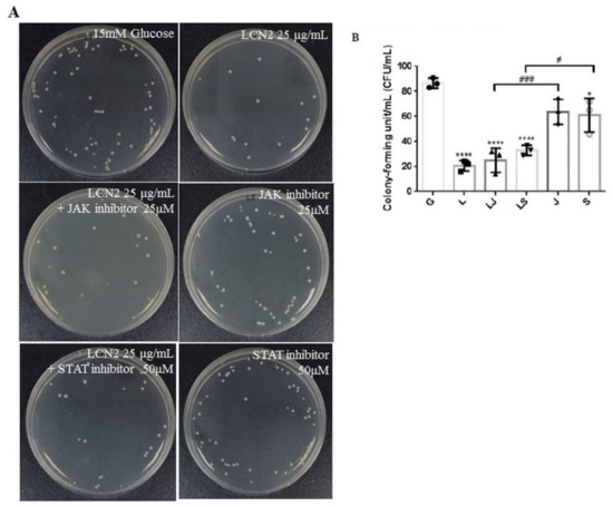 The human normal bladder cell line SV-HUC-1 was cultured in F-12K medium (Kaighn’s Modification of Ham’s F-12 Medium) containing 2 mM L-glutamine and 1500 mg/L sodium bicarbonate (GIBCO-BRL #21127-022) in the presence of 50 ng/mL bovine pituitary extract medium at 37 °C in a 5% CO2 incubator. The culture medium was replaced every 2–3 days. A cell culture medium containing 15 mM glucose was used to culture 5.5 × 105 cells for 24 h; the cells were then treated with LCN2 (MyBioSource, San Diego, CA, USA) at different concentrations (1, 5, and 25 μg/mL) for 24 h and infected with pGFP-UPEC at an MOI of 1:100 for 4 h. Finally, the bacterial adhesion and invasion abilities were detected by immunofluorescence microscopy and the plate counting method, respectively. Untreated cells were used as the normal control group, and cells only infected with pGFP-UPEC were used as the positive control group. The other group of cells undergoing the same treatment were mixed with RIPA buffer, and the cell protein was collected for subsequent protein expression determination. The signal blocking experiments were executed by pretreatment with 25 μM JAK inhibitor (Ruxolitinib; MedChem Express, Princeton, NJ, USA) or 50 μM STAT inhibitor (Fludarabine; Selleck Chemicals Inc., Houston, TX, USA) with 15 mM glucose for 24 h, followed by the LCN2 pretreatment (25 μg/mL), UPEC infection, and subsequent experiments, as describe above.