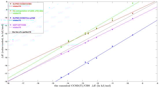 - Jurečka, P.; Šponer, J.; Černý, J.; Hobza, P. Benchmark database of accurate (MP2 and CCSD(T) complete basis set limit) interaction energies of small model complexes, DNA base pairs, and amino acid pairs. Phys. Chem. Chem. Phys. 2006, 8, 1985–1993. [Google Scholar] [CrossRef]