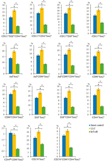 In lung cancers, different CSC populations have been identified according to the expression of some markers, such as CD44, CD90, CD117, EGF, Axl, and Sox2, in different combinations [15]. An attempt has already been made to study the interaction between CSCs and CD8+ T-cells [18]. We suggest that lung cancer cells and CSCs are potential targets for reprogrammed T-cells. On the 17th day of the experiment, we observed an increase in the number of cancer cells and CSCs in the lungs of C57BL/6 mice from the experimental group. This were proliferating cells (CD117+EGF+CD44+Sox2+, CD117+CD44+Sox2+, CD117+EGF+Sox2+, Axl+Sox2+, Axl+CD90+CD44+Sox2+, CD90+CD44+Sox2+, CD90+Sox2+, EGF+Sox2+, EGF+CD44+Sox2+, CD276+Sox2+, CD44+Sox2+, and CD117+Sox2+) (Figure 2) and cells with immunophenotypes Axl+, Axl+CD117+, CD45-Axl+, CD45+Axl+, and CD45-CD117+ (Figure 3). Injections of hrT-cells significantly reduced the percentage of tumor cells and CSCs in the lungs of LLC C57BL/6 mice compared to untreated LLC mice (d17) (Figure 2 and Figure 3, Figure S3). The exceptions were cells with immunophenotypes Axl+ and CD45-CD117+, the content of which did not change under the influence of cell therapy, as well as cells with the immunophenotypes CD45-Axl+ and CD117-EGF-CD44-PD-L1+, where the number increased.