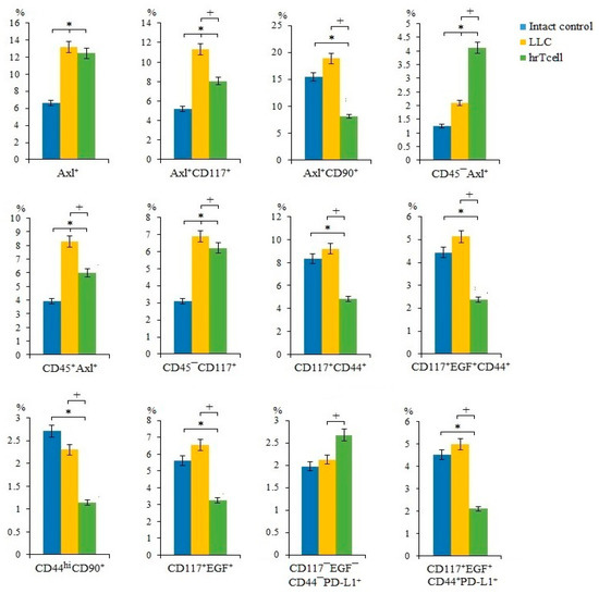 The effect of therapy with human reprogrammed CD8+ T-cells (hrT-cell) on the level of cancer cells and cancer stem cells (CSCs). The proportion (% of total mononuclear cells number) of Axl+, CD117+CD44+, CD117+EGF+CD44+, CD117+EGF+, CD117-EGF-CD44-PD-L1+, CD117+EGF+CD44+PD-L1+, Axl+CD117+, Axl+CD90+, CD45+Axl+, CD44hiCD90+, CD45-Axl+, and CD45-CD117+ CSCs in lungs of C57BL/6 mice with LLC on d17. Cells were analyzed by flow cytometry using antibodies for CD117, CD44, CD276, CD90, Axl, EGF, and PD-L1. * Differences are significant in comparison with the intact group (p < 0.05); +—for comparison with the mice with LLC (metastatic model). The results are presented from 3 independent series of experiments.