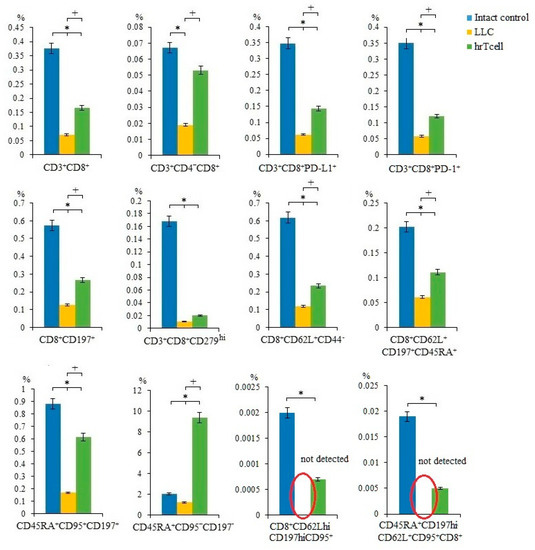 The effect of therapy with human reprogrammed CD8+ T-cells (hrT-cell) on level of T-cells in the blood. The proportion (% of total mononuclear cells number) of CD3+CD8+, CD3+CD4-CD8+, CD3+CD8+PD-L1+, CD3+CD8+PD-1+, CD8+CD197+, CD3+CD8+CD279hi, CD8+CD62L+CD44-, CD8+CD62L+CD197+CD45RA+, CD45RA+CD95+CD197+, CD45RA+CD95+CD197-, CD8+CD62LhiCD197hiCD95+, CD45RA+CD197hiCD62L+CD95+CD8+ T-cells in blood C57BL/6 mice with LLC on d17. Cells were analyzed by flow cytometry using antibodies for CD3, CD4, CD8, CD44, CD62L, CD45RA, CD95, CD197, PD-1, and PD-L1. * Differences are significant in comparison with the intact group (p < 0.05); +—for comparison with the mice with LLC (metastatic model) (p < 0.05). The results are presented from 3 independent series of experiments.
