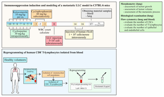 To assess the antitumor and antimetastatic activity, reprogrammed human CD8+ T-cells were administered intravenously to recipient mice with LLC at 1 × 106 cells/mouse in 0.1 mL of PBS on the 14th and 16th days of the experiment (Figure 5).