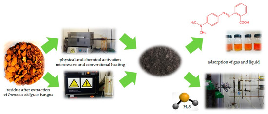 The main aim of the study was to obtain cheap and effective biocarbons from the residue of the extraction of chaga fungi (Inonotus obliquus) and its comprehensive characterization by the determination of textural parameters, the content of surface oxygen functional groups and pH of its water extract (Figure 1). The biocarbons were tested as potential adsorbents for the removal of liquid pollutants represented by methyl red sodium salt. The effectiveness of the dye adsorption on the surface of biocarbons was evaluated by determination of the effects of the initial concentration of dye solution, time of contact between the adsorbate and adsorbent, pH and temperature of the reaction system on the sorption capacities. Another series of experiments was performed to assess the effectiveness of the obtained biocarbons as adsorbents of gas pollutants, represented by hydrogen sulfide. The effects of the methods of activation and variant of heating (microwave and conventional) on the physicochemical and sorption properties of the biocarbons were also examined.