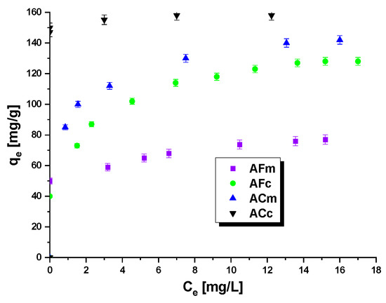 The sorption capacities of the biocarbons were also found to depend on the mode of heating and were higher for samples AFc and ACc (conventional heating) than for AFm and ACm (microwave heating). The impact of the mode of heating was higher on the samples obtained by a two-step physical activation of the precursor. For the microwave-heated biocarbons AFm and AFc, the sorption capacities were higher by 51 mg (AFm—77 mg/g, AFc—128 mg/g). The sorption capacities of the samples obtained by chemical activation of the residue of the extraction of chaga fungi and heated by microwave radiation and conventional heating differed only by 16 mg (ACm—142 mg/g, ACc—158 mg/g).