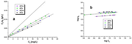 The methyl red sodium salt adsorption from its water solutions was interpreted assuming the linear forms of the Langmuir and Freundlich equations (Table 4, Figure 4a,b) [31]. The Langmuir model of adsorption is based on the assumption that on the adsorbent surface of the adsorbate a monomolecular layer is formed. It would mean that the surface of biocarbons has a certain number of active centers that are able to adsorb only one molecule of the adsorbate [32]. The Langmuir isotherm is represented by the following linear Equation (1):