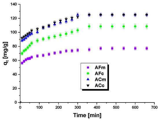 The effect of the time of contact of the dye solution with the biocarbon on the effectiveness of adsorption was also characterized. The results are presented in Figure 5 and imply that the effect of the time of contact between the adsorbent and the adsorber has a significant influence on the sorption capacity of the biocarbons studied. In the first 30–40 min of stirring the methyl red sodium salt was adsorbed very quickly on the biocarbons, most probably because of a large number of free active centers on their surfaces. With increasing time of contact, the number of free active centers decreases, and their gradual saturation is observed. Moreover, the active centers become less accessible because of the repulsive interactions between the adsorbed dye molecules and those that are in the solution [39]. As follows from the course of the isotherms, the state of adsorption equilibrium is reached after 300–350 min, which means that at that time there are no free active centers, and the sorption capacity does not increase.