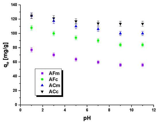 The next task was to check the effect of the pH of the dye solution on the sorption capacities of the biocarbons obtained. The results measured for the dye solvent pH values from 1 to 11 are displayed in Figure 7. The plots of sorption capacities as a function of pH values (Figure 7) show that at pH 1 the capacities were the highest. With increasing pH, the effectiveness of the removal of methyl red sodium salt decreased. The most pronounced decrease, by 24 mg/g, was noted for the sample obtained as a result of chemical activation and heated by microwave irradiation, ACm. In solutions with low pH, the dominant ions were H+, which enhance the positive charge on the adsorbent surface, promoting the adsorption of the anionic dye. According to the literature data, at low pH, the removal efficiency of adsorbed dye is higher, while at high pH it is lower [42].