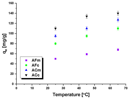 The impact of temperature on the sorption capacity of the biocarbons studied towards methyl red sodium salt was also evaluated and the results are given in Figure 9. The efficiency of the dye removal was shown to increase with increasing temperature, which is related to the greater mobility of methyl red sodium salt in solution at higher temperatures [43]. The most pronounced effect of temperature on the biocarbon sorption capacity was observed for sample ACm. With the temperature increasing from 25 to 65 °C, its sorption capacity increased by over 30 mg. The smallest temperature impact was noted for sample AFm (physical activation, microwave irradiation), whose capacity increased only by 17 mg upon the same increase in temperature.