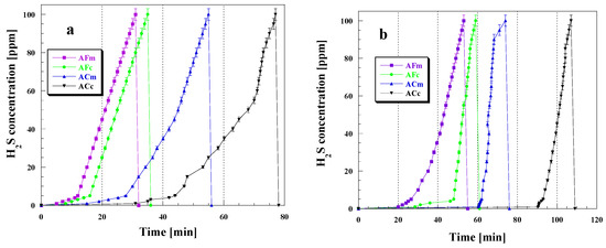 The effectiveness of hydrogen sulfide removal was found to depend on the conditions of the process, method of sample activation and mode of its heating. For all biocarbon samples studied, higher sorption capacities were obtained in wet conditions, which is a consequence of the formation of a water film on their surfaces [45]. The greatest difference between sorption capacity values measured in wet and dry conditions was detected for sample ACm (chemical activation, microwave irradiation). When the adsorption was carried out in wet conditions, for all biomaterials the time of breakthrough of the carbon bed was longer (Figure 10b). The greatest difference between the time of breakthrough in wet and dry conditions was observed for sample ACc for which it was 31 min in dry conditions and 90 min in the presence of steam. The same sample proved to be the most effective in the adsorption of hydrogen sulfide, irrespective of the conditions of the process. The sorption capacity of this sample in dry conditions was 55.3 mg, while in wet conditions it was 77.8 mg. The efficiency of hydrogen sulfide removal also depended on the surface area and degree of porous structure development of the biocarbons; the larger the surface area and the more developed the porous structure, the greater the sorption capacity toward H2S (see the data in Table 2 and Table 8). According to the literature data, the mechanism of H2S adsorption on the surface of the biocarbons depends on pH [45]. A too-low pH of the sample hinders the hydrogen sulfide dissociation, while a too-high value leads to the presence of polysulfides and elemental sulfur. When the pH is moderate (slightly acidic), sulfur may be oxidized to sulfur dioxide [45]. The biocarbons obtained by chemical activation of the residue of the extraction of chaga fungi (Inonotus obliquus) have an acidic surface so they showed the highest sorption capacities. However, it should be noted that the chemical character of the sample is not the only parameter determining hydrogen sulfide adsorption as it also depends on the conditions of the process and degree of the surface area development.