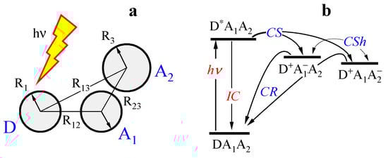 We consider a molecular triad of the type DAA, where D is the electron donor and photosensitizer, and A/A are the electron acceptors. Optical excitation of this compound leads to a population of the locally excited state DAA→ DAA, and triggers a series of electronic transitions, including charge separation to the DAA and DAA states, charge shift between the A and A units, charge recombination back to the DAA state, and radiationless deactivation of the excited state. The general scheme of the reaction is shown in Figure 2 and involves the following transitions