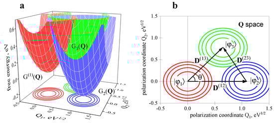 Here are the coordinates of the FES minimum (unknown model parameters so far), and is the equilibrium free energy of the nth electronic state. The mutual arrangement of the surfaces in the space is fully determined by the matrix. To show this, one can use the definition of