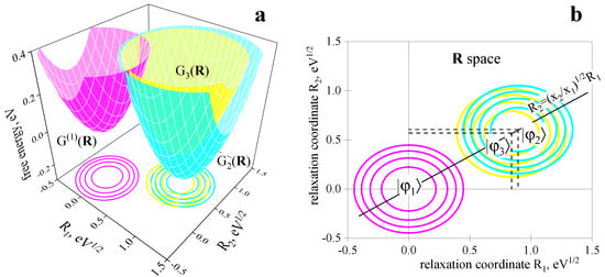 (a) Free energy surfaces of the ET states as functions of the relaxation coordinates and . The surfaces are calculated by orthogonal projection from the space onto the. The and parameters correspond to acetonitrile (given in the text), other parameters are the same as in Figure 3. (b) Arrangement of the FESs minima on the plane: the points are located on the straight line given by the equation .