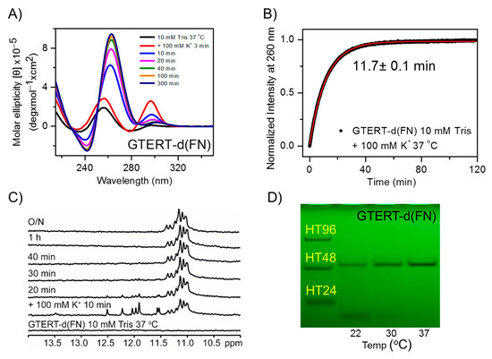 Previously, we reported the finding of a spectral change of GTERT-d(FN) in 100 mM K+ solution at room temperature (~22 °C) [23]. Given that cellular experiments are generally conducted at 37 °C, we studied spectral change of GTERT-d(FN) in a 100 mM K+ solution at 37 °C by time-dependent CD spectra (Figure 1A). Initially, the detection of a major CD band at 295 nm suggests that the formation of the non-parallel G4s is the main component. Subsequently, the decrease of the 295 nm band associated with the increase of the 265 nm band suggests structural change from the nonparallel G4s (named G4-1) to parallel G4s (named G4-2). The conversion time is obtained by measuring the increase of the CD signal at 265 nm, which is fitted to a single exponential function with a time constant of 11.7 ± 0.1 min (Figure 1B). Notably, the conversion time is measured to be 57.4 ± 1.4 min at 30 °C and 318 ± 3.4 min at 22 °C (Figure S1). In addition, NMR spectra of GTERT-d(FN) show two distinct components: the G4-1 component, characterized by several fine imino proton signals between 11.5–12.5 ppm appears initially but disappears within 1 h, and the G4-2 component, characterized by several fine imino proton signals on top of a broad band in the region of 11.0–11.5 ppm, increases due to the conversion of the G4-1 component in 100 mM K+ solution at 37 °C (Figure 1C). Notably, the NMR results clearly show that the initial component is the G4-1 formation at room temperature (Figure S1). Furthermore, PAGE assays show an intramolecular band and an intermolecular band at 22 °C, but only an intermolecular band at 37 °C for GTERT-d(FN) after the 1 h addition of 100 mM K+ (Figure 1D). This finding is consistent with the 11.7 min at 37 °C and 318 min at 22 °C for structural change from the intramolecular nonparallel G4s (G4-1) to the intermolecular parallel G4s (G4-2) of GTERT-d(FN) in 100 mM K+ solution.