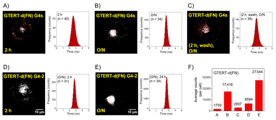 Time-gated FLIM images of exogenous GTERT-d(FN) G4s in CL1-0 live cells. Time-gated FLIM images of 5 μM o-BMVC mixed with 15 μM GTERT-d(FN) G4s incubated with CL1-0 live cells for 2 h (A) and overnight (O/N) (B). The incubation of 5 μM o-BMVC mixed with 15 μM GTERT-d(FN) G4s with CL1-0 live cells for 2 h followed by washing twice with PBS and then cultivated in a new medium for O/N culture (C). The incubation of 5 μM o-BMVC mixed with 15 μM GTERT-d(FN) G4-2 with CL1-0 live cells for 2 h (D) and overnight (O/N) (E). Here a decay time ≥ 2.4 ns is characterized in white and a decay time < 2.4 ns is characterized in red. The histograms of the average photon counts per cell with a decay time ≥ 2.4 ns for each case (F).