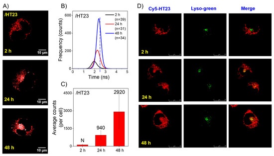 Imaging study of exogenous HT23 G4s in CL1-0 live cells. Time-gated FLIM images of 5 μM o-BMVC mixed with 15 μM HT23 G4s incubated with CL1-0 live cells for 2 h, 24 h, and 48 h (A). The corresponding plots of average photon counts of o-BMVC fluorescence per cell after 2 h, 24 h, and 48 h incubation of HT23 G4s with CL1-0 live cells (B). Histogram of the average photon counts per cell with a decay time ≥ 2.4 ns for each case, where N denotes negligible (C). Confocal images of Cy5-HT23 G4s incubated with CL1-0 live cells for 2 h, 24 h, and 48 h (left), and then stained by LysoTracker green at a concentration of 50 nM and incubated with the cells for 15 min (middle) together with their merges (right) (D).