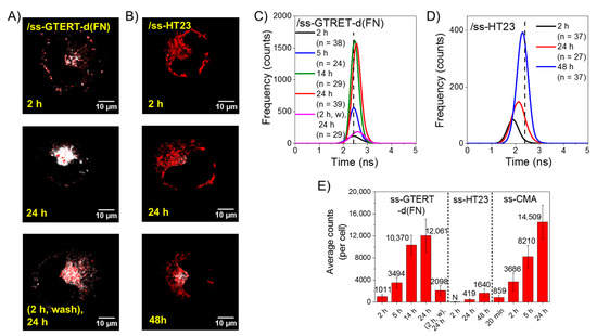 We have further examined the time-gated FLIM images of 5 μM o-BMVC mixed with 15 μM ss-HT23 after the 2 h, 24 h, and 48 h incubations with CL1-0 live cells (Figure 4B). The detection of parallel G4s in the lysosomes after incubation with ss-HT23 is much less than the incubation of ss-GTERT-d(FN) with CL1-0 live cells. This is probably due to the degradation of ss-HT23 before its parallel G4 formation in the lysosomes. The corresponding histograms of their average photon counts of o-BMVC fluorescence per cell are shown in Figure 4C,D, together with the plots of their average photon counts per cell with the decay time ≥ 2.4 ns are shown in Figure 4E. For comparison, the plots of the average photon counts of o-BMVC fluorescence per cell after the incubation of ss-CMA with CL1-0 live cells for 20 min, 2 h, 5 h, and 24 h are also shown in Figure 4E, which were obtained from the previous results [22].