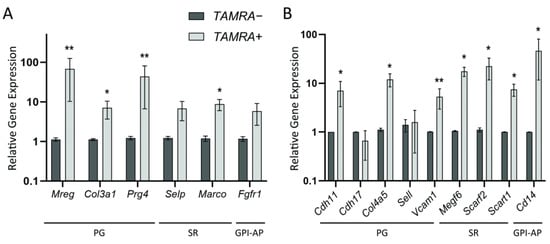 2.1.2. Identification of Group-Specific Genes for PGs, SRs, and GPI-APs Overexpressed in TAMRA+ Krebs-2 and HH47 Cells