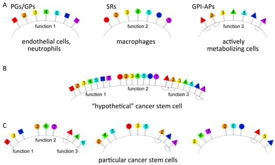 | Groups of the Membrane-Anchored Proteins with the Same Particular Function | “Hypothetical” Tumor Stem-like Cell Based on the Published Data [20,27,28,29,30,31] | Krebs-2 | HH47 |
