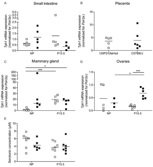 2.2.2. Tph1 Expression in Intestine, Placenta, and Mammary Glands from 129P2/OlaHsd Mice