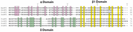 MTs have classically been defined as low molecular weight (<100 amino acids) and cysteine-rich (≈15–30%) proteins that, because they bind transition metal ions and lack enzymatic functions, have been related with metal homeostasis and detoxification in living beings ([18,19]; reviewed in [20]). Their cysteine residues (Cys, C) are arranged in CC, CxC or CCC motifs, whose number and distribution define the structural domains that form metal–thiolate clusters. In mollusks, for instance, MT domains have been classified into six types: α domains (with 11/12 Cys), β1, β2 and β3 domains (with 9 Cys, each one with different Cys motif arrangements), γ domains (with 10 Cys) and δ domains (with 14 Cys) [21]. Sequence analyses have led to suggest that most mollusk MTs would be bidomain proteins that combine an invariable carboxy-terminal β1 domain with one of the other five domains (α, β2, β3, γ or δ) in a lineage-specific manner: an α domain in some Bivalvia, Cephalopoda, Polyplacophora and Solenogastres (also known as Neomeniamorpha) MTs, a β2 domain in several Bivalvia, Monoplacophora, Scaphopoda and Solenogastres MTs, a β3 domain in all Gastropoda MTs except in Patellogastropoda MTs that contain a γ domain, and a δ domain only found in Caudofoveata, (also known as Chaetodermomorpha) MTs [21,22,23].