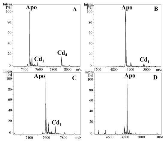 Deconvoluted ESI-MS spectra of the apo-MTs obtained after the demetallation by acidification (pH 2.4) of recombinant Cd-protein complexes. Notice that in the production process, the digestion with thrombin of the GST-MT fusion proteins resulted in the addition of two extra residues (glycine and serine) at the N-terminal end of the purified MTs that, as shown in previous studies, did not interfere with the metal-binding features of recombinant MTs [25,26]. (A) apo-NpoMT1, (B) apo-αNpoMT1, (C) apo-FcaMT1 and (D) apo-δFcaMT1.