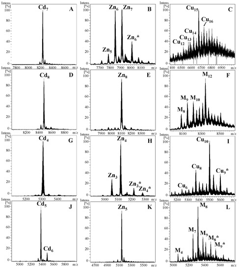 Deconvoluted ESI-MS spectra of metal–protein complexes recombinantly produced in E. coli growth in metal-enriched culture medium. (A) Cd-NpoMT1, (B) Zn-NpoMT1, (C) Cu-NpoMT1, (D) Cd-FcaMT1, (E) Zn-FcaMT1, (F) Cu-FcaMT1, (G) Cd-αNpoMT1, (H) Zn-αNpoMT1, (I) Cu-αNpoMT1, (J) Cd-δFcaMT1, (K) Zn-δFcaMT1 and (L) Cu-δFcaMT1. M in panels F and L stands for heterometallic (Zn + Cu)-MT complexes. Glycosylated metal-MT species are depicted with an asterisk (*).