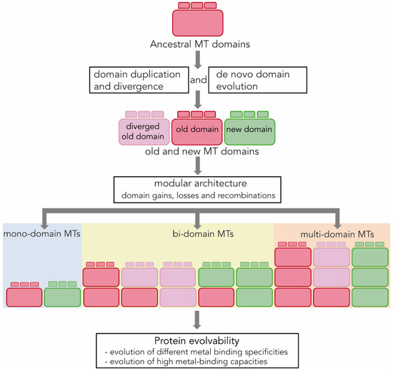 A protein domain is a well-defined region of a protein that constitutes a stable, independently folding, and compact structural unit that might perform a specific function [1,2,3]. Protein domains may occur alone, but are more frequently found in combination with other domains in multidomain proteins [4,5,6]. Novel multidomain proteins might arise by rearranging preexisting domains or by merging de novo emerged domains with old domains. While domain rearrangements have been analyzed extensively ([4,6,7,8,9,10,11]; reviewed in [12,13]), the rise and evolution of new domains are still poorly understood [14,15,16], and examples in which the new domains have been functionally characterized are very scarce [17]. In this scenario, metallothioneins (MTs), a heterogeneous family of proteins made of metal-binding domains, are becoming a valuable case study to infer events of the de novo emergence of domains and to understand the impact of a modular architecture on the evolution of novel proteins.