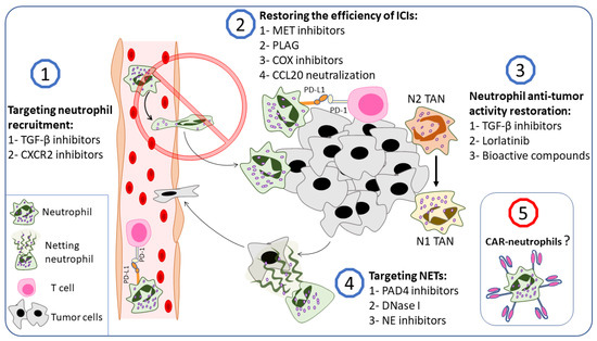 Cancer therapies have achieved much in the past few decades. Cancer cells, however, are extremely adept at evading the immune system and developing resistance to therapy [229,230]. Since neutrophils can promote tumorigenesis and contribute to therapy resistance, targeting them may be considered a novel therapeutic approach in addition to standard therapeutic protocols [231]. In tumor-bearing mice, neutrophil depletion was shown to reduce tumor growth, decrease metastasis potency, and enhance immunotherapy efficiency [232,233,234]. Understanding neutrophilic phenotypes in cancer makes the possibility of neutrophil reprogramming or skewing toward an anti-tumor phenotype a potential therapeutic option. Additionally, several strategies affecting TANs and g-MDSCs were considered under preclinical and clinical conditions. These strategies include the inhibition of neutrophils’ pro-tumor activities or promoting their anti-tumor ones, inhibition of neutrophil recruitment to the tumor microenvironment, and targeting NETs. Moreover, neutrophils gained huge interest in the field of cancer immunotherapy, which exceeded expectations and led to the generation of CAR-neutrophils [17].