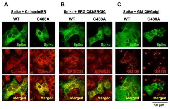 Intracellular spike localization in Vero cells was examined by confocal microscopy. Green signals are spike proteins probed with the anti-spike monoclonal antibody 1A9. The co-localization at the ER and ERGIC were visualized by co-staining with calnexin and ERGIC 53, respectively (red signal; Figure 2A,B, respectively). Merged yellow signals suggest that both the WT and C488A mutant spike proteins were similarly detected in the ER and ERGIC. The co-localization at the Golgi apparatus was observed by co-staining with GM130 (Figure 2C). As described previously [11], WT spike expression induced Golgi fragmentation (Figure 2C, left panels); however, the C488A mutant spike was not co-localized with GM130 and did not induce Golgi fragmentation (Figure 2C, right panels). These data suggest that C488A mutation suppressed spike protein trafficking to the Golgi apparatus.