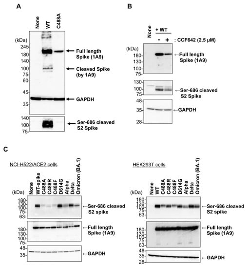 Defect of S1/S2 processing in C488 mutant spike proteins. (A) Spike-expressing plasmid was transfected into VeroE6/TMPRSS2 cells, and the cell lysate was prepared 20 h post-transfection. Full-length and Ser-686 cleaved spike proteins were probed with anti-spike (1A9) and cleaved SARS-CoV-2 spike (Ser686) antibodies, respectively. GAPDH is shown as a loading control. (B) Wild-type spike-expressing plasmid was transfected in HEK293 cells, which were treated with CCF642 for 13 h at 5 h post-transfection, followed by cell lysate preparation. Full-length and Ser-686 cleaved spike proteins were detected with anti-spike (1A9) and cleaved SARS-CoV-2 spike (Ser686) antibodies, respectively. (C) Each mutant spike-expressing plasmid was transfected in NCI-H522/hACE2 (left panels) and HEK293T (right panels) cells. After 20 h, cell lysates were prepared, and full-length and Ser-686 cleaved spike proteins were detected with anti-spike (1A9) and cleaved SARS-CoV-2 spike (Ser686) antibodies, respectively.