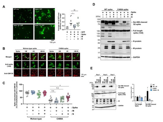 M protein did not affect C488A-mutant spike. (A) VeroE6/TMPRSS2 cells were co-transfected with spike-, M-, N-expressing plasmids with pEGFP-C1. The cells were fixed at 20 h post-transfection, and the green fluorescence protein (GFP) signals were photographed with conventional fluorescence microscopy. Areas of GFP-positive green cells were measured in each picture by ImageJ software, and average area size of GFP-positive cells in a picture was plotted in the right graph. One-way ANOVA with Tukey-HSD was performed to assess statistical significance. n.s. means “not significant”, and * indicates p < 0.01. (B) Spike-expressing plasmids were co-transfected with SARS-CoV-2 M or N protein-expressing plasmid in Vero cells, which were fixed and permeabilized. Co-localization of spikes (green) with GM130 (red) were analyzed by confocal microscopy. White arrows indicate complete co-localization (yellow) of spikes with GM130. (C) Co-localization of spikes and GM130 was examined in the transfected cells (n ≥ 156), and the ratio of co-localization is shown. One-way ANOVA with Tukey-HSD was performed to assess statistical significance. n.s. means “not significant”, and * indicates p < 0.01. (D,E) SARS-CoV-2 spike-expressing plasmid was co-transfected with M- or N-expressing plasmid in HEK293T cells. The cell lysate was prepared after 20 h, and full-length and Ser-686 cleaved spike proteins were detected by Western blotting with anti-spike (1A9) and cleaved SARS-CoV-2 spike (Ser686) antibodies, respectively. Triplicated transfected samples were analyzed (Exp. 1–3), and signal intensity was quantified by ImageJ (right graph in E).