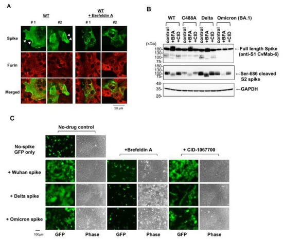 Brefeldin A (BFA) is a fungal metabolite that disrupts intracellular membrane traffic at the ER–Golgi complex junction [18]. Hackstadt et al. reported that BFA-mediated Golgi apparatus disruption inhibited viral replication [11]. To confirm the involvement of ER–Golgi trafficking in S1/S2 processing of spike proteins, we tested the effect of BFA and observed that BFA treatment disrupted WT spike plasma membrane localization (Figure 5A), but not furin localization (red signal). Further, Western blot analysis using anti-Ser-686 antibodies indicated that BFA treatment suppressed S1/S2 processing of every spike protein variant (Figure 5B). BFA treatment also affected the electrophoretic mobility of Ser-686 cleaved S2 protein on Western blot analysis, suggesting that BFA-mediated Golgi-targeting inhibition might suppress glycosylation maturation of the spike protein. The function of the spike protein after BFA treatment was examined using a cell–cell fusion assay. BFA treatment inhibited WT, Delta, and Omicron spike-mediated syncytium formation in VeroE6/TMPRSS2 cells (Figure 5C). The spike-mediated syncytium was not inhibited by CID-1067700, a Rab7 GTPase competitive inhibitor that blocks lysosomal trafficking during beta-coronavirus egress [19]. Thus, ER-to-Golgi trafficking and S1/S2 processing of spike proteins are critical for the functional targeting of spike proteins to the plasma membrane.