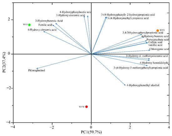 Furthermore, the polyphenolic compounds of WFJ, WFW, and WFV were characterized by PCA (Figure 1). The results showed that two PCs explained 97.1% of the variability (eigenvalues > 1), and the contribution rates of PC1 and PC2 were 59.7% and 37.4%, respectively. The polyphenolic compounds in the WFV sample were mainly found to be the positive for PC1, while those in the WFJ and WFW samples were found to be negative for PC1. In addition, the polyphenolic compounds in WFJ and WFV had positive values for PC2, while those in WFW were negative for PC2. PCA can be used to analyze and distinguish the different samples in the different fermentation stages, which had different distributions on the analysis graph []. The polyphenolic compounds in different samples during the fermentation process could be separated well, indicating the differentiated antioxidant characteristics.
