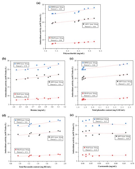 Correlation analysis of bioactive ingredients and antioxidant activity during the fermentation processes: (a) polysaccharide, (b) betaine (c) total phenolics content, (d) total flavonoids content, and (e) carotenoids.