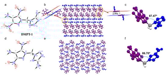 The suitable crystals of compounds DMPT-1 and DMPT-2 were obtained by slow evaporation from a mixture of ethyl acetate and petroleum ether. Compound DMPT-1 crystallizes in the monoclinic space group P21/c with a crystal density of 1.806 g cm−3 at 296 K (Z = 4). The crystal structure of compound DMPT-1 is given in Figure 1a. The C-NO2 groups with C-N bonds lengths are 1.394(3) Å (C12-N2), 1.434(3) Å (C7-N1); compared to the other C-N bonds of N,N’-methylene bridge C4-N6, 1.441(3) Å and C4-N5, 1.452(2) Å, the C-N bonds lengths are shorter. Crystal packing of DMPT-1 exhibits a face-to-face stacking with a packing index of 74.8%. The distance between the pyrazoles (purple part) and pyrazoles (purple part) faces is 2.991 Å. The distance between the tetrazoles (blue part) and tetrazoles (blue part) faces is 3.145 Å. The N-methylene-N bridge dihedral angle between tetrazoles (blue part) and pyrazoles (purple part) ring is 87.47° for compound DMPT-1.