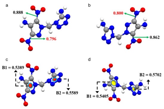The thermostability of energetic materials is one of the most significant parameters in assessing their safety level under severe environments. The decomposition temperature was determined using differential scanning calorimetric (DSC) measurements at a heating rate of 10 °C min−1 under a dry nitrogen atmosphere. Compound DMPT-1 exhibits the lowest decomposition temperature of 191 °C, whereas DMPT-2 has a higher thermal stability of 206 °C. In general, for polynitro energetic compounds, the C-NO2 bonds are always regarded as the weakest bonds, which can trigger the decomposition of the compound [29]. The Mayer bond orders of C-NO2 bonds for DMPT-1 and DMPT-2 were also calculated to evaluate their molecular stabilities, as shown in Figure 2a,b. The weakest Mayer bond order of C-NO2 bond for compound DMPT-1 (BN = 0.794) is shorter than that of DMPT-2 (BN = 0.797), showing that the bond strength of C-NO2 bonds in DMPT-1 is stronger than that of DMPT-2, which could explain in part the difference in thermal stability. Generally, aromaticity is considered an important parameter for the determination of molecular stability [30,31]. Therefore, the aromaticity of each heterocycle atmosphere could also be quantitatively described through the multicenter bond orders analysis using Multiwfn3.5 [32]. As shown in Figure 2c,d, the multicenter bond order of the tetrazole ring in DMPT-1 (B1 = 0.5589) is shorter than that of DMPT-2 (B1 = 0.5702), which indicates that the tetrazole ring of DMPT-2 exhibits better aromaticity than that of DMPT-1, which is consistent with their thermal behaviors.