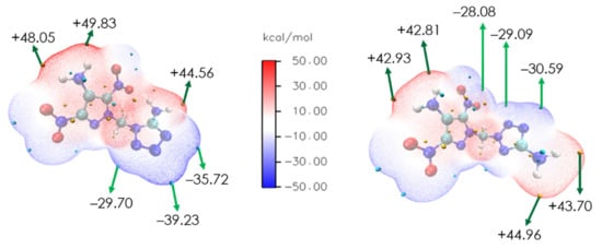 To better explain the bond strength differences between compounds DMPT-1 and DMPT-2, their electrostatic potential (ESP) surfaces were analyzed. As shown in Figure 3, the red and blue regions represent the positive and negative potentials, respectively. In comparison to DMPT-1, the difference between the maxima and minima of ESP for the branching DMPT-2 molecule is smaller (DMPT-1: +49.83, −39.23 kcal/mol; DMPT-2: +44.96, −30.59 kcal/mol), so that DMPT-2 exhibits a more uniform charge distribution. The C-NO2 and tetrazole ring on DMPT-2 moiety exhibit minimum potential parts, which are much lower than the C-NO2 and tetrazole ring on DMPT-1, thus indicating the distinct stability of regioisomers as may be related to the ESP values (DMPT-1, Td, 191 °C; FS, 108 N; DMPT-2, Td, 209 °C; FS, 192N) [33]. In principle, the lower negative ESP values and more significant electronegative regions (blue areas) on the molecular surface often give rise to lower sensitivities, which rationalize the different mechanical sensitivities.
