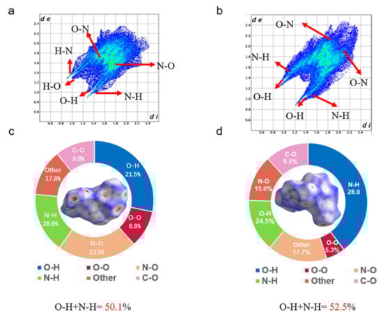 To gain insight into understanding the relationship between weak interactions and the performance in energetic materials, the two-dimensional (2D) fingerprint spectra and Hirshfeld surfaces of DMPT-1 and DMPT-2 were studied using CrystalExplorer [34]. Generally, the blue and red regions on the Hirshfeld surfaces represent low and high close contact populations, respectively. As shown in Figure 4, The Hirshfeld surfaces of DMPT-1 were near “L”-shaped structures, and the Hirshfeld surfaces of DMPT-2 were slightly distorted. In comparison to DMPT-1, the reddest spots are more evenly distributed for the DMPT-2 molecule, showing that compound DMPT-2 can form hydrogen bonds with more surrounding molecules, which suggests that the sensitivity of compound DMPT-2 (FS = 192 N) is better than that of compound DMPT-1 (FS = 108 N). At the same time, the weak interactions in these molecules are given in the 2D fingerprint plots. For DMPT-1 and DMPT-2, the proportion of O…H & H…O and N…H & H…N in the total weak interaction was 50.1% and 52.5%, respectively. They exhibit strong hydrogen bonding interactions, theoretically explaining the lower sensitivity (IS = 30 J).