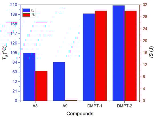 Detonation performance is a significant parameter of energetic materials for evaluating practical applications. The detonation performances of two compounds are calculated by EXPLO5 (v6.01) software. The values of detonation velocity (vD) and detonation pressure (P) were evaluated according to the crystal densities and calculated heats of formation. The calculated detonation velocities and detonation pressures of DMPT-1 (vD = 8618 m s−1, P = 30.3 GPa) and DMPT-2 (vD = 8450 m s−1, P = 28.6 GPa) can be seen in Table 1. Meanwhile, two compounds both exhibit better detonation velocity and detonation pressure than alkyl-bridged analogues (B5, vD = 7889 m s−1, P = 23.2 GPa, B4, vD = 7768 m s−1, P = 21.8 GPa). Compounds DMPT-1 (Td = 191 °C) and DMPT-2 (Td = 209 °C) exhibit better thermal stability compared to ADNP (Td = 178 °C) (Figure 5).