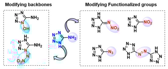 Furthermore, 5-aminotetrazole (AT) provides a platform for a variety of functionalized tetrazoles, which have broad applications in almost all areas of energetic materials [12]. The functionalization of AT was mainly focused on modifying the tetrazolyl backbone and the substituted group, respectively. As can be seen in Scheme 1, the introduction of explosophores, e.g., azido, nitro, and nitramino groups, enhances the energetic performance remarkably. Nevertheless, balancing high energy with stability is still a highly challenging task. Based on the literature, very few outstanding compounds possess superior overall performance compared to the benchmark energetic materials [13,14,15]. For most high-energy derivatives, further practical applications are impeded by relatively poor thermal stability and sensitivity.