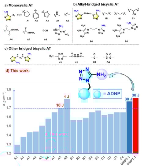 (a) Monocyclic derivatives of 5-aminotetrazoles (A9: determined by X-ray diffraction and converted into room-temperature values); (b) alkyl-bridged bicyclic 5-aminotetrazoles; (c) other bridged bicyclic 5-aminotetrazoles; (d) bar graph of density and impact sensitivity for AT-based energetic compounds.