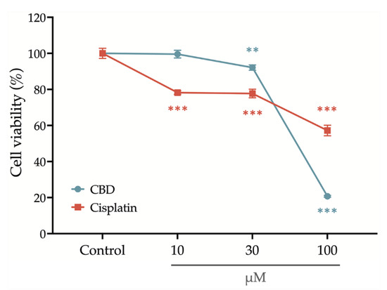 Figure 2 shows that CBD and cisplatin induce apoptosis in a dose-dependent manner. Treatment with 10 μM cisplatin significantly decreases the cell viability (
