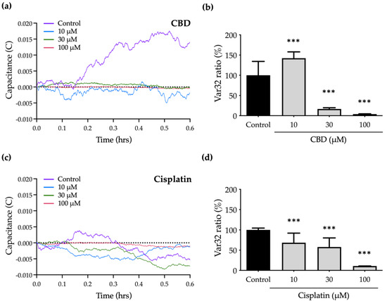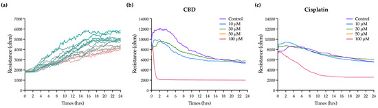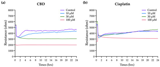 Figure 3b,c shows that treatment with 10 and 30 μM CBD and cisplatin has no significant effect on the resistance, compared with the control. The cell resistance decreases significantly when it is exposed to 100 μM CBD, and the lowest resistance e (near the value of the cell-free condition, as shown in
