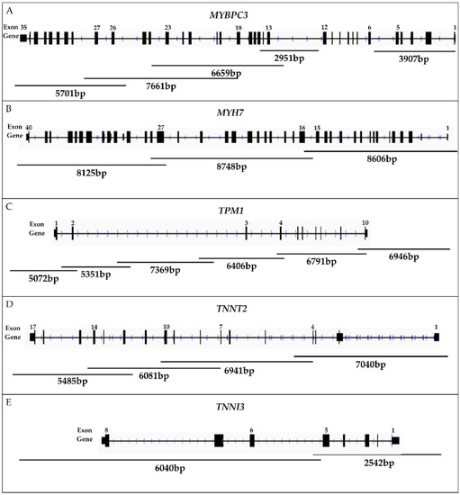 By means of the Primer-BLAST primer design tool on the NCBI website, primer pairs were designed for long PCR products covering the whole sequence of the five sarcomeric protein genes (MYBPC3, MYH7, TPM1, TNNT2, and TNNI3; Figure 1; Table S1).