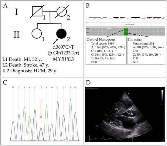 The case of HCM (patient 1) with p.Gln1233Ter (rs397516037) in the MYBPC3 gene. (A) The pedigree of the proband (MI: myocardial infarction); (B) molecular genetic testing of the patient by ONT and Illumina methods; (C) Sanger sequencing; (D) echocardiogram: left ventricle, parasternal long axis position.