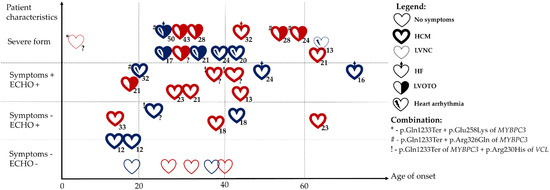 Several asymptomatic HCM mutation carriers have been reported in the literature (Figure 4). Age of onset of HCM varies among carriers of p.Gln1233Ter of MYBPC3 from the second decade of life to more than 60 years of age (Figure 4). There is a tendency for earlier onset of the disease in males. The single published case of onset of left ventricular non-compaction in early childhood was a compound heterozygote with p.Gln1233Ter and another MYBPC3 pathogenic variant leading to p.Glu258Lys substitution [34]. We have previously found that there is accumulation of rare variants in genes associated with arrhythmogenic right ventricular cardiomyopathy in patients with HCM [41]. It must be noted that several patients with symptomatic and severe HCM carrying p.Gln1233Ter of MYBPC3 also have arrhythmias (Figure 4).
