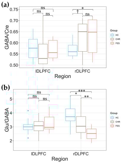 2.2. Group Differences in DLPFC Glu/Creatine (Cre), GABA/Cre, and Glu/GABA
